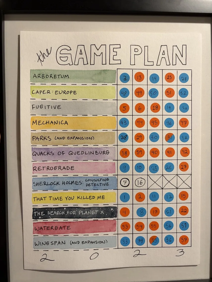She hand-painted a grid to track the 12 games on our list and who won. It sat proudly on our mantle where we’d update each week when we sat down to play, just the two of us.