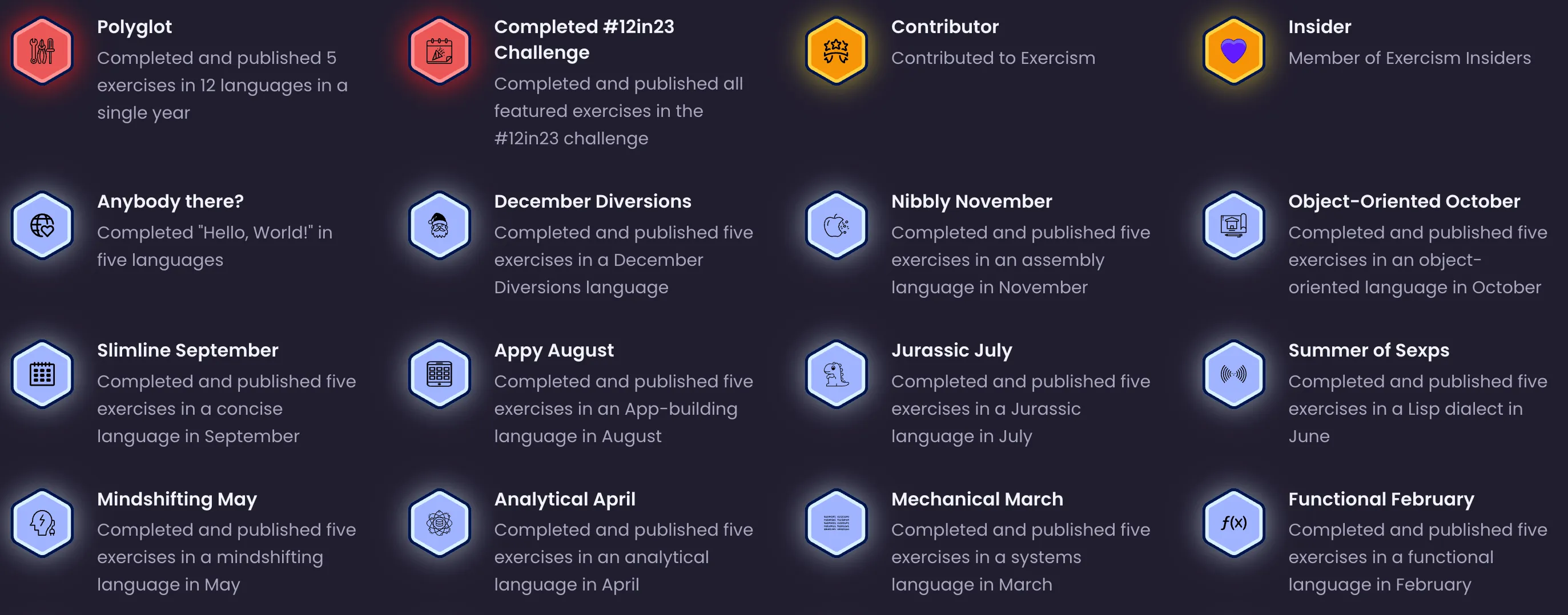 When January started, the Exercism team were still in the process of choosing monthly themes, so that month’s language was dealer’s choice. Lacking direction, I kicked the year off with Go. I had done a crash course in the language in mid 2022, but I hadn’t used it much since and didn’t feel at all proficient.