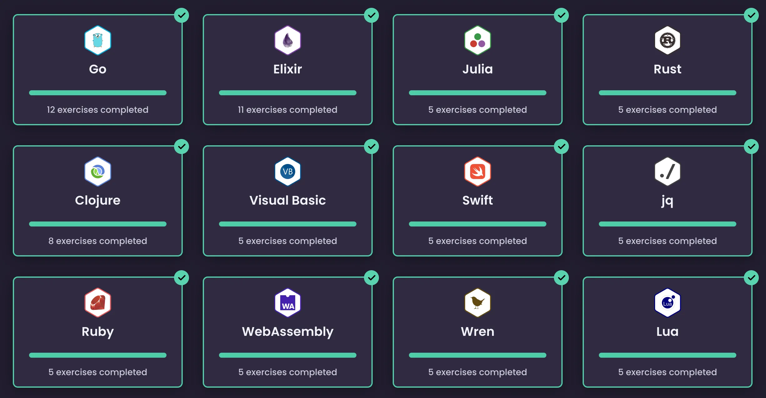 Now that the year is almost over I’m incredibly pleased with how the project went. I successfully tried 12 new languages, met great people in the Exercism community, and shipped some cool open source contributions along the way! In this post, I run through them all and talk about what I got from each.