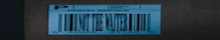 The barcode in the closet is some stretched out letters in disguise. It’s hard to read as it goes by, but if you crop and stretch the image, it’s a little more clear: