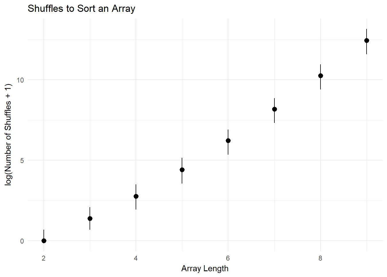 puts "It took an average of #{res.average.round(2)} shuffles to sort an array of length #{n}"endWith our measurement tools in hand, I ran the trials with increasingly long arrays. It’s tough to graph numbers that have such a large range (2 element array sorted fairly quickly, large ones… did not), so we used a logarithmic scale. The lines on either side of the dots show the middle 50% of the number of shuffles. As you can see, the number of shuffles scales pretty aggressively with the length of the input.