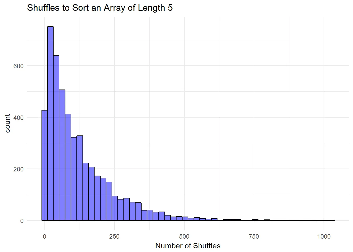 # Performs the bogosort, lets us know how many tries it tookdef num_shuffles(arr) c = 0 # the sort itself until arr.sorted? arr.shuffle! c += 1 end cendSince the randomness of the sort begets such a high variance in results, we’ll want to do a fair number of trails and take the average.