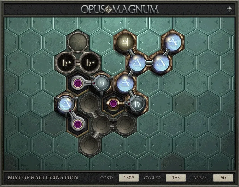 Having played a number of Zachtronics games, there’s a set of tropes that I expect: light story, a thematic solitaire game, and algorithmic puzzles. Opus Magnum acknowledges them, refines them, and excels in every regard. It is the steampunk realization of a visual programming concept that gained popularity with SpaceChem. Though the puzzles are the main focus, there’s a story that engages without distracting. The music and UI complement the game’s themes of science and magic well. More than the code-based games, watching levers and molecules rotate and move is mesmerizing (see below).
